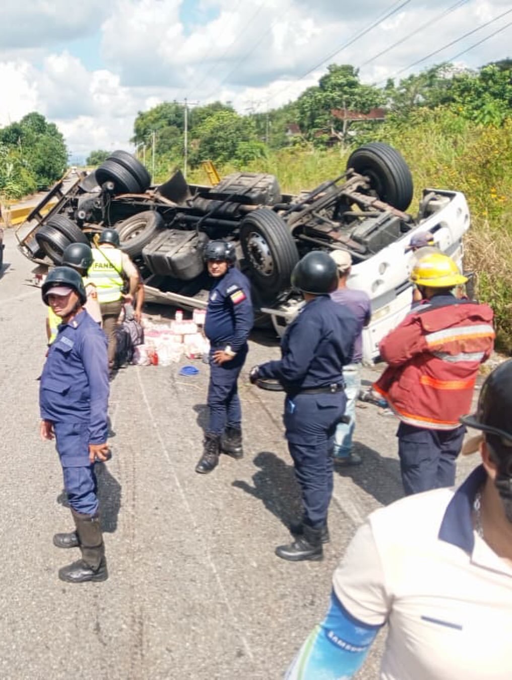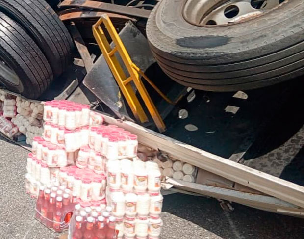 Versiones de testigos indican que el conductor de la pesada unidad, perteneciente a una empresa distribuidora de alimentos procesados, perdió el control debido a una presunta falla mecánica, lo que causó que volcara y quedara con las ruedas hacia arriba, con varias cajas de mayonesas en envases plásticos a un lado de la vía.