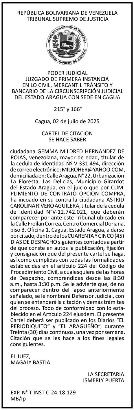 Edictos y carteles CARTEL DE CITACIÓN GEMMA MILDRED HERNÁNDEZ DE ROJAS Por El Aragueño - agosto 1, 2025 0 FacebookXPinterestWhatsAppLinkedinEmailImpresiónTelegramCopy URL