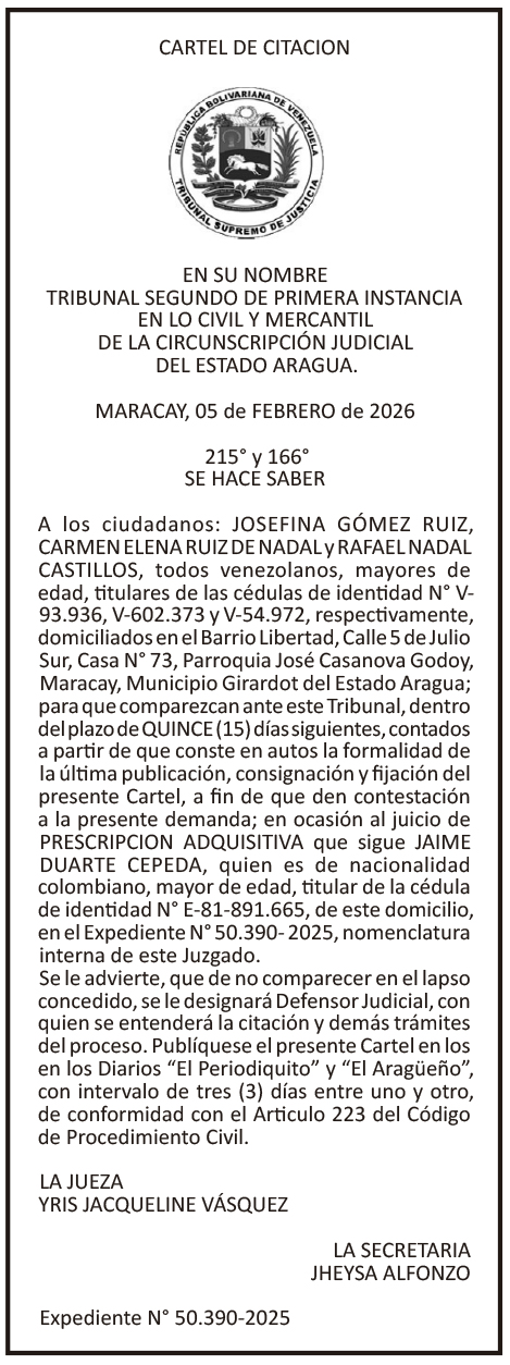 Edictos y carteles CARTEL DE CITACIÓN JOSEFINA GÓMEZ, CARMEN RUÍZ Y RAFAEL NADAL Por El Aragueño - febrero 23, 2026 0 FacebookXPinterestWhatsAppLinkedinEmailImpresiónTelegramCopy URL