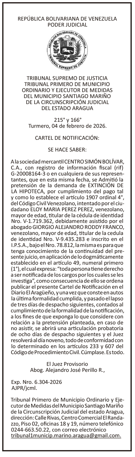 Edictos y carteles Cartel de Notificación: Centro Simón Bolívar, C.A. Por El Aragueño - febrero 13, 2026 0 FacebookXPinterestWhatsAppLinkedinEmailImpresiónTelegramCopy URL