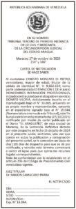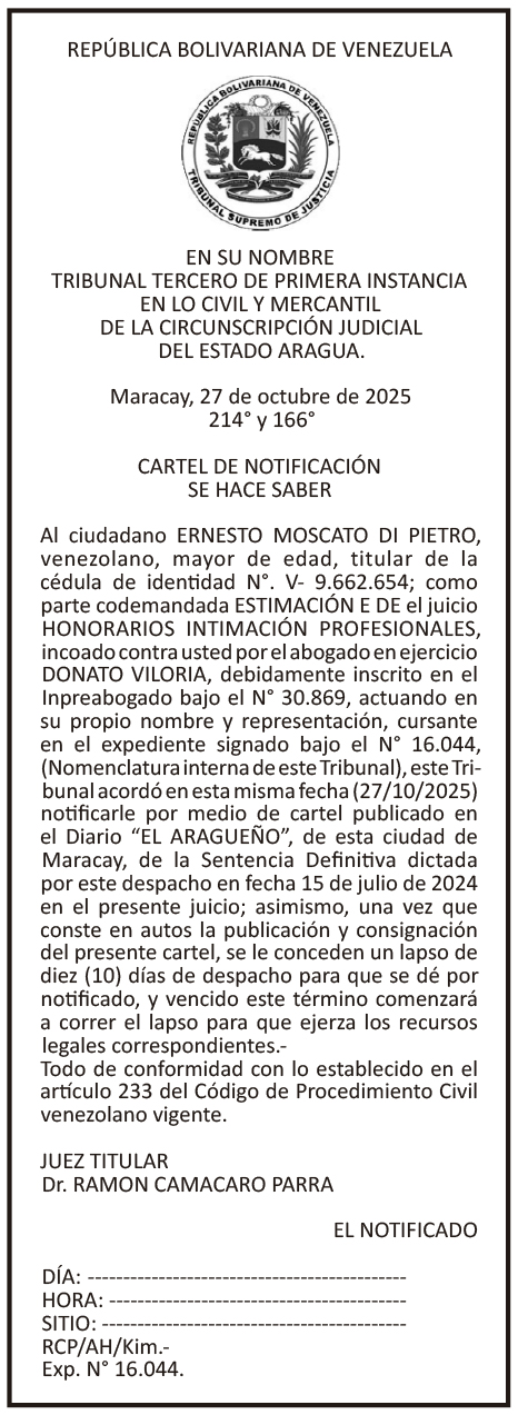 Edictos y carteles Cartel de Notificación: Ernesto Moscato Di Pietro Por El Aragueño - noviembre 6, 2025 0 FacebookXPinterestWhatsAppLinkedinEmailImpresiónTelegramCopy URL