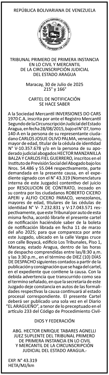 Edictos y carteles CARTEL DE NOTIFICACIÓN INVERSIONES DO CARS 1970 C.A. Por El Aragueño - agosto 5, 2025 0 FacebookXPinterestWhatsAppLinkedinEmailImpresiónTelegramCopy URL