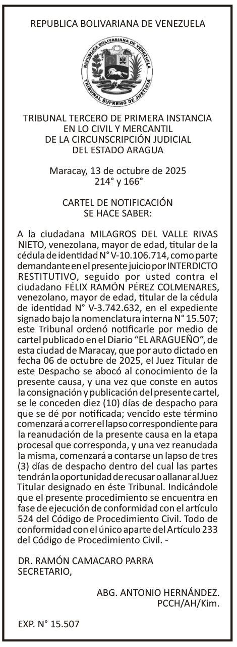 Edictos y carteles Cartel de Notificación: Milagros del Valle Rivas Nieto Por El Aragueño - octubre 20, 2025 0 FacebookXPinterestWhatsAppLinkedinEmailImpresiónTelegramCopy URL