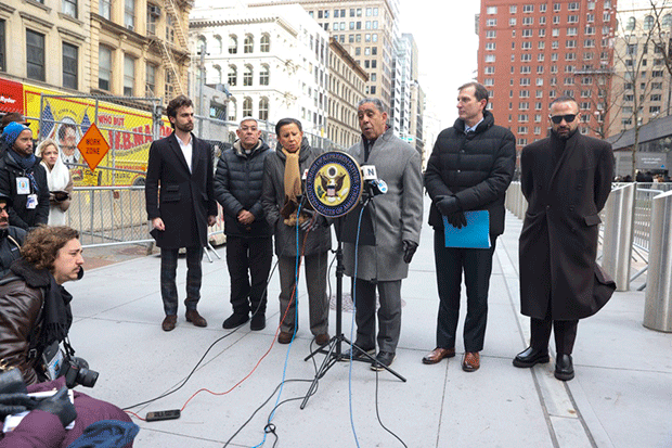 Los congresistas neoyorquinos Nydia Velázquez, Adriano Espaillar y Dan Goldman, junto al californiano Robert Garcia, que integra el Comité de Supervisión de la Cámara de Representantes, presentaron la legislación frente al polémico edificio 26 Federal Plaza de la Gran Manzana, que acoge un tribunal y la sede local de ICE.
