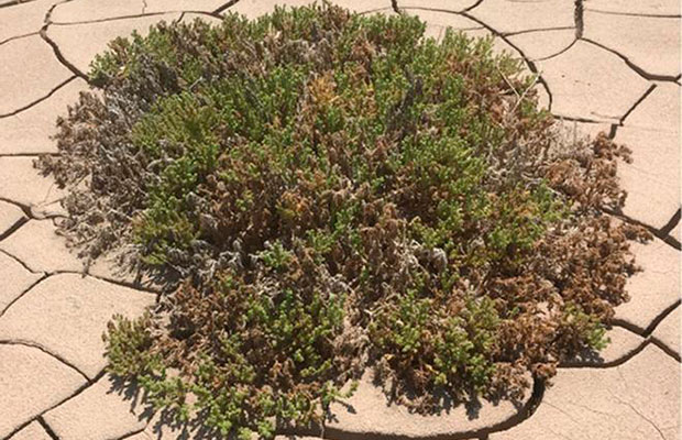 Sus hojas carnosas están recubiertas por una película de sal visible a simple vista, mientras que otras especies vecinas permanecen secas.
