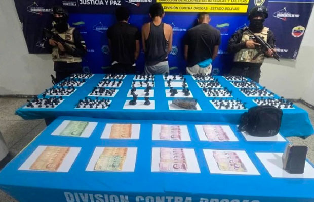 Desarticulada red de distribución en Bolívar: En el sector Barrio Centro del municipio Caroní, estado Bolívar, el CPNB realizó la detención en flagrancia de tres sujetos que llevaban un bolso con 373 envoltorios de presunta marihuana, con un peso de 2,913 kilogramos.
