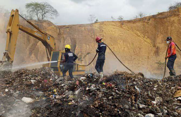 El Cuerpo de Bomberos informó que para el combate y control del incendio se utilizaron 31.500 litros de agua entre las 3:00 de la tarde y la noche de este miércoles 18 de febrero, labores que continúan este jueves para cumplir con «la extinción total del fuego y mitigar la contaminación ambiental y los graves problemas de salud que pueden causar los gases tóxicos» que derivan del incendio de desechos sólidos.