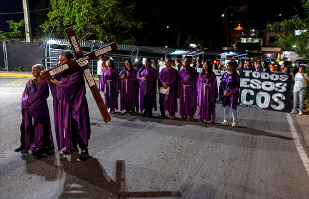 Con velas y algunos vistiendo túnicas moradas, familiares de presos políticos y activistas de Venezuela realizaron la noche de este miércoles un viacrucis en las afueras del Rodeo I, una cárcel ubicada cerca de Caracas.