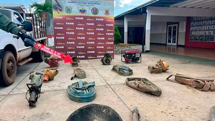 Entre el material confiscado destacan 70 metros de manguera de descarga de dos pulgadas, 8 metros de manguera de cuatro pulgadas, tres turbinas de 6 pulgadas, dos motores de 12 HP, un generador eléctrico, y herramientas como un martillo de percusión, chumaceras, palas, picos, además de 20 metros de plástico encerado negro y una batea artesanal.