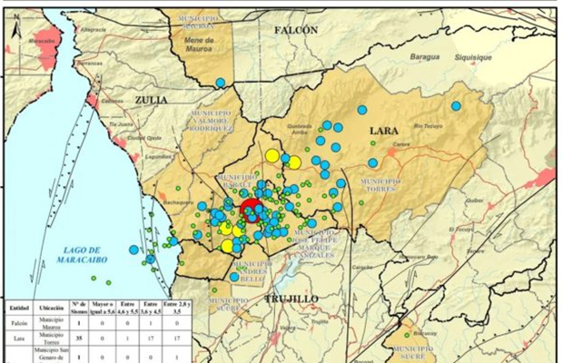 Según el mapa de sismicidad de Funvisis, la totalidad de los 35 sismos detectados en el territorio larense se concentraron en el municipio Torres.