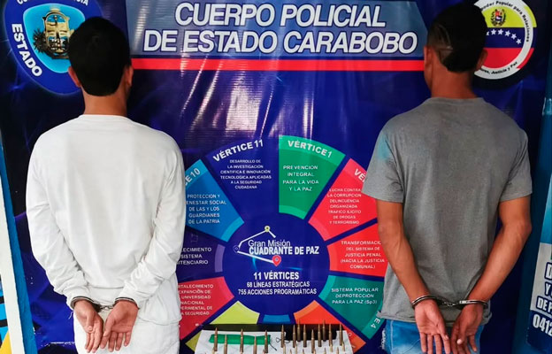 Dos sujetos fueron aprehendidos por funcionarios del cuerpo policial del estado Carabobo (Policarabobo), adscritos al Centro de Coordinación Policial Diego Ibarra – Estación Mariara, por tenencia de municiones de guerra.