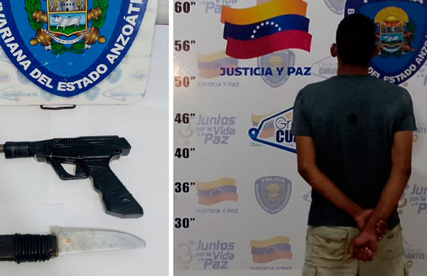 Aunque durante la inspección corporal no se le encontraron evidencias, los funcionarios localizaron en el área un facsímil de arma de fuego tipo pistola, color negro y sin serial visible, elaborado en material sintético, así como un cuchillo de características similares. La víctima reconoció plenamente al individuo como su agresor.