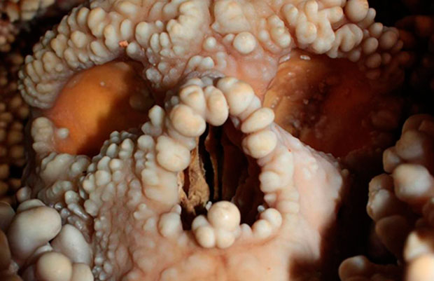 Una vez abajo, rodeados de estalactitas y estalagmitas, descubrieron una pequeña sala donde, en medio de una gran columna de calcita cubierta de coraloides, sobresalía un cráneo humano excepcionalmente bien preservado.