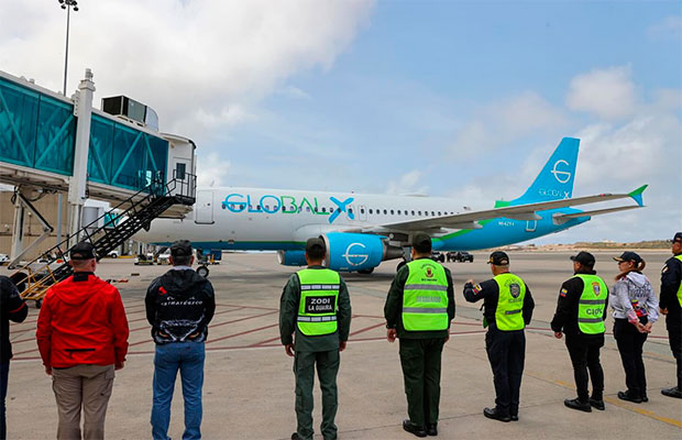 El avión fue operado por la aerolínea estadounidense Global X y aterrizó en el Aeropuerto Internacional Simón Bolívar de Maiquetía, que sirve a Caracas, según imágenes oficiales.
