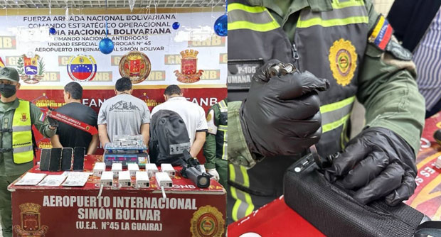 Sin embargo, el comandante estratégico operacional de la Fanb, Domingo Hernández Lárez, precisó que en el aeropuerto solo capturaron a uno de los hombres, un ciudadano colombiano que en su equipaje llevaba oculto en una corneta de sonidos y dos power bank, con tres envoltorios de droga con un peso aproximado de 0,832 kilogramos de cocaína.