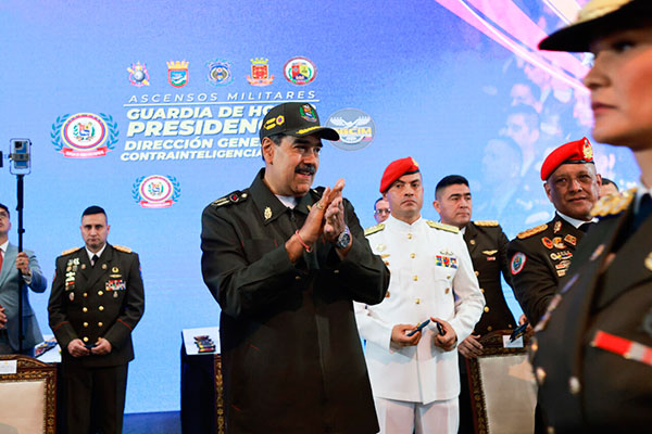 En un acto de ascensos militares, Maduro aseguró que la Fuerza Armada Nacional Bolivariana “está desplegada de norte a sur” y “de este a oeste en combate” contra “las bandas criminales, violentas, narcotraficantes, mercenarias y contrarrevolucionarias” que “siempre vienen (…) de Colombia”.