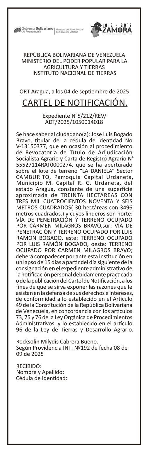 Edictos y carteles NOTIFICACIÓN JOSÉ LUIS BOGADO BRAVO Por El Aragueño - enero 12, 2026 0 FacebookXPinterestWhatsAppLinkedinEmailImpresiónTelegramCopy URL