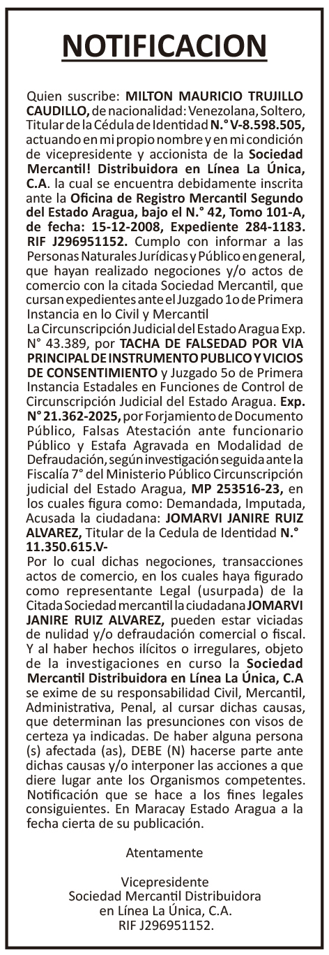 Edictos y carteles NOTIFICACIÓN MILTON MAURICIO TRUJILLO CAUDILLO Por El Aragueño - diciembre 5, 2025 0 FacebookXPinterestWhatsAppLinkedinEmailImpresiónTelegramCopy URL