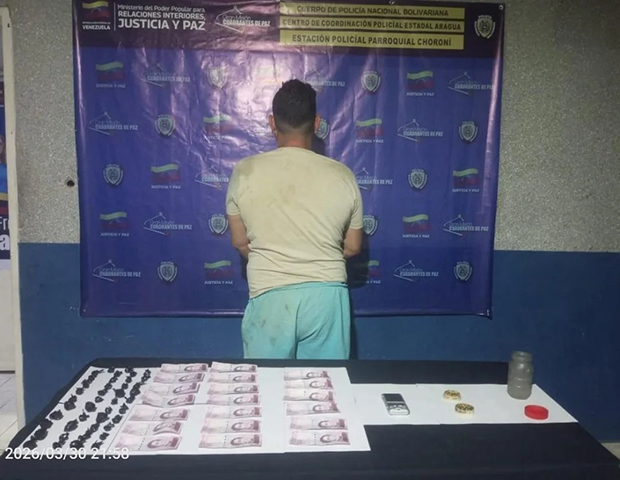 Funcionarios del Cuerpo de Policía Nacional Bolivariana (CPNB), detuvieron en flagrancia a Yorman Velandia, de 45 años de edad, por su presunta responsabilidad en el delito de microtráfico de drogas. La aprehensión ocurrió en el sector Colina de Santa Bárbara de la parroquia Choroní, zona turística del estado Aragua.