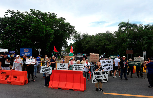 Convocados por la organización Madres contra la Guerra, los manifestantes gritaron lemas como «Puerto Rico sin milicia, queremos justicia» y «por la paz vamos todos a luchar», al tiempo que pintaron en el suelo con tiza «fuera yanquis» y «Trump asesino».