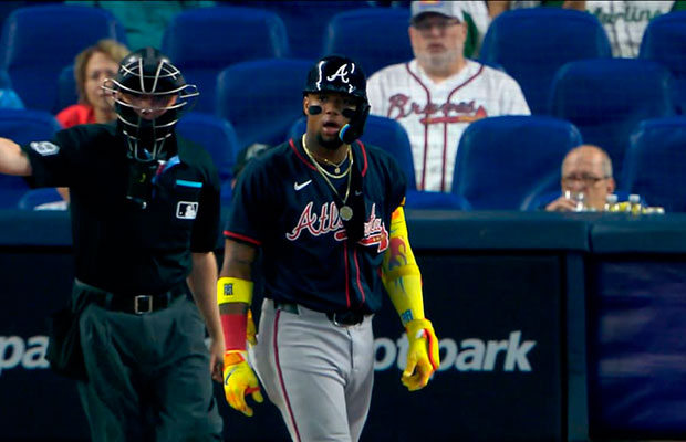 Las bancas se vaciaron con calma cuando Acuña protestó después de que un sinker de 93.3 millas por hora de Ryan Gusto le golpeara el protector del brazo izquierdo en la tercera entrada. El bolazo ocurrió un pitcheo después de que Matt Olson conectara un jonrón de dos carreras que le dio a la fachada del segundo nivel más allá de la barda del bosque central.