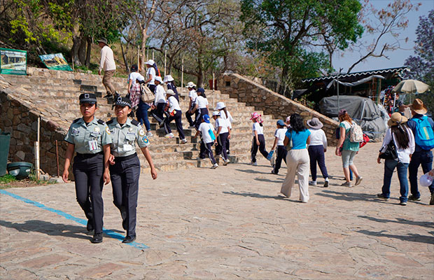 Tras aquellos sucesos, una decena de agentes femeninos de la Guardia Nacional se encuentran en los accesos y las plazas principales del complejo arquitectónico que se ubica entre los cinco más visitados de México.